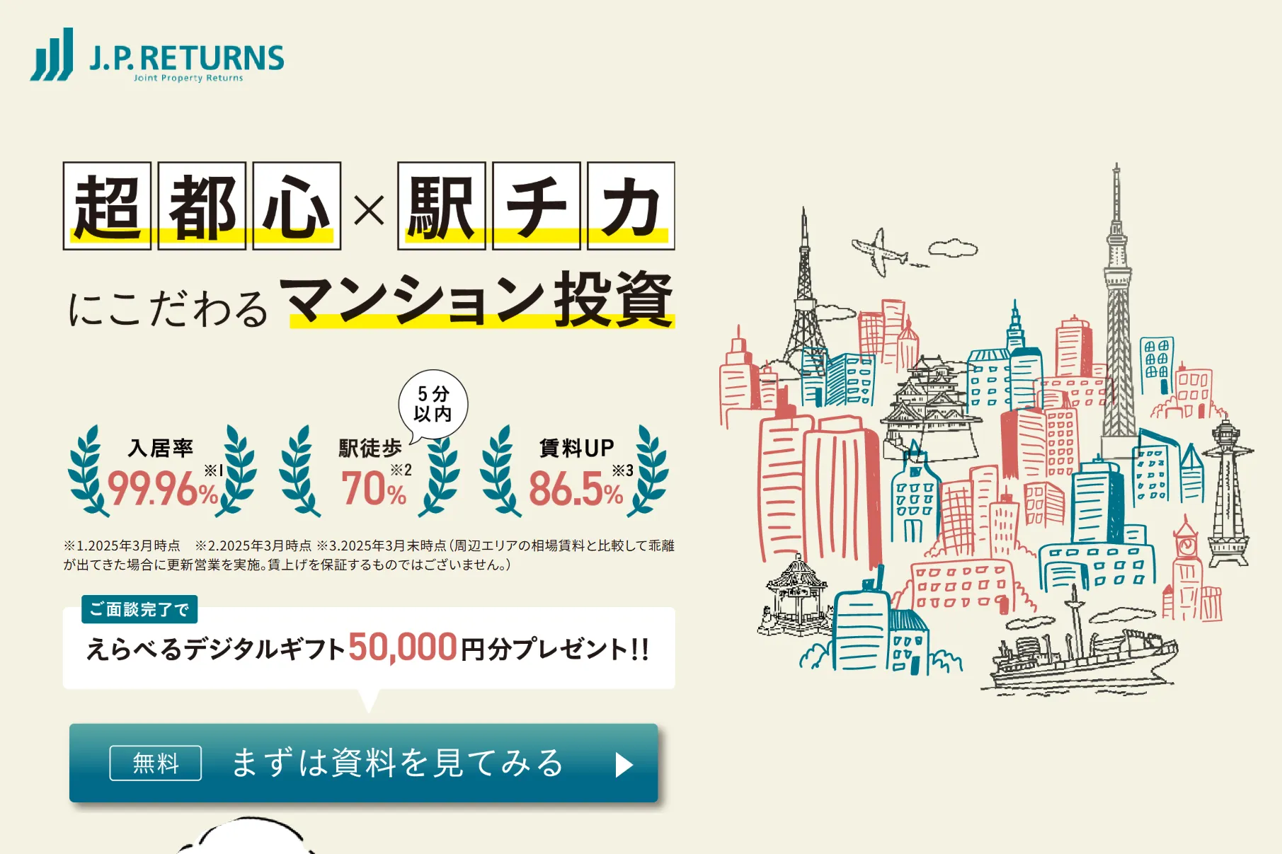 | JPリターンズ | 東京中古ワンルーム (リノベ済) | エリア特化 (東京中心)、中古×リノベ、高入居率の実績 | 東京で堅実投資を検討したい方、安定インカム重視派、中古ワンルーム希望の初心者 | 管理実績豊富 |